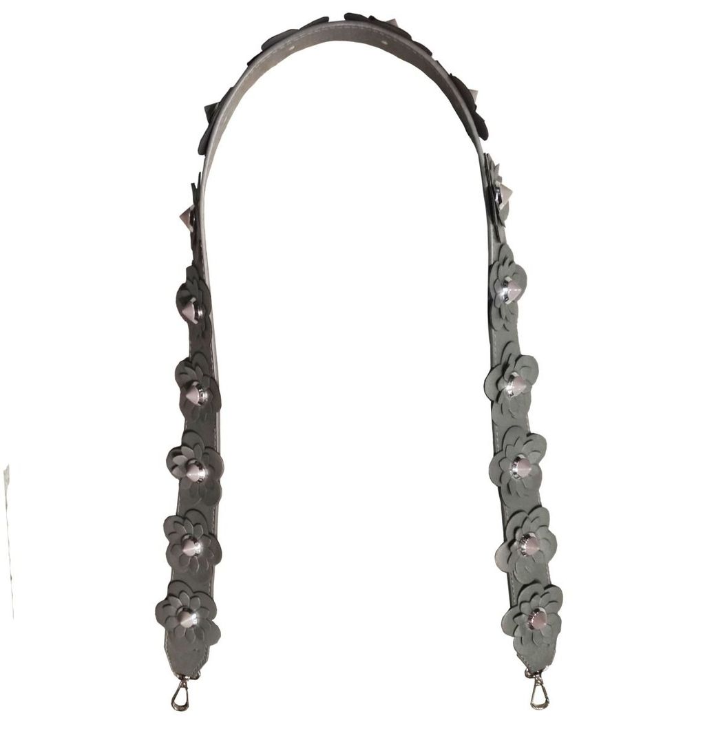 Серая ручка для сумки из искусственной кожи длиной 105см и шириной 5.5см в романтическом стиле - один из набирающий силу трендов. Отлично дополняет круглые сумки и клатчи, придавая оригинальности образу. Может как сочетаться с цветом сумки, так и радикально отличаться от него. Необычный длинный ремень - один из наиболее действенных способов подогнать аксессуар под себя, разнообразить сочетание универсальных деталей. Декорирована крупными цветами из искусственной кожи, завершающимися конусовидными клепками серебристого цвета.