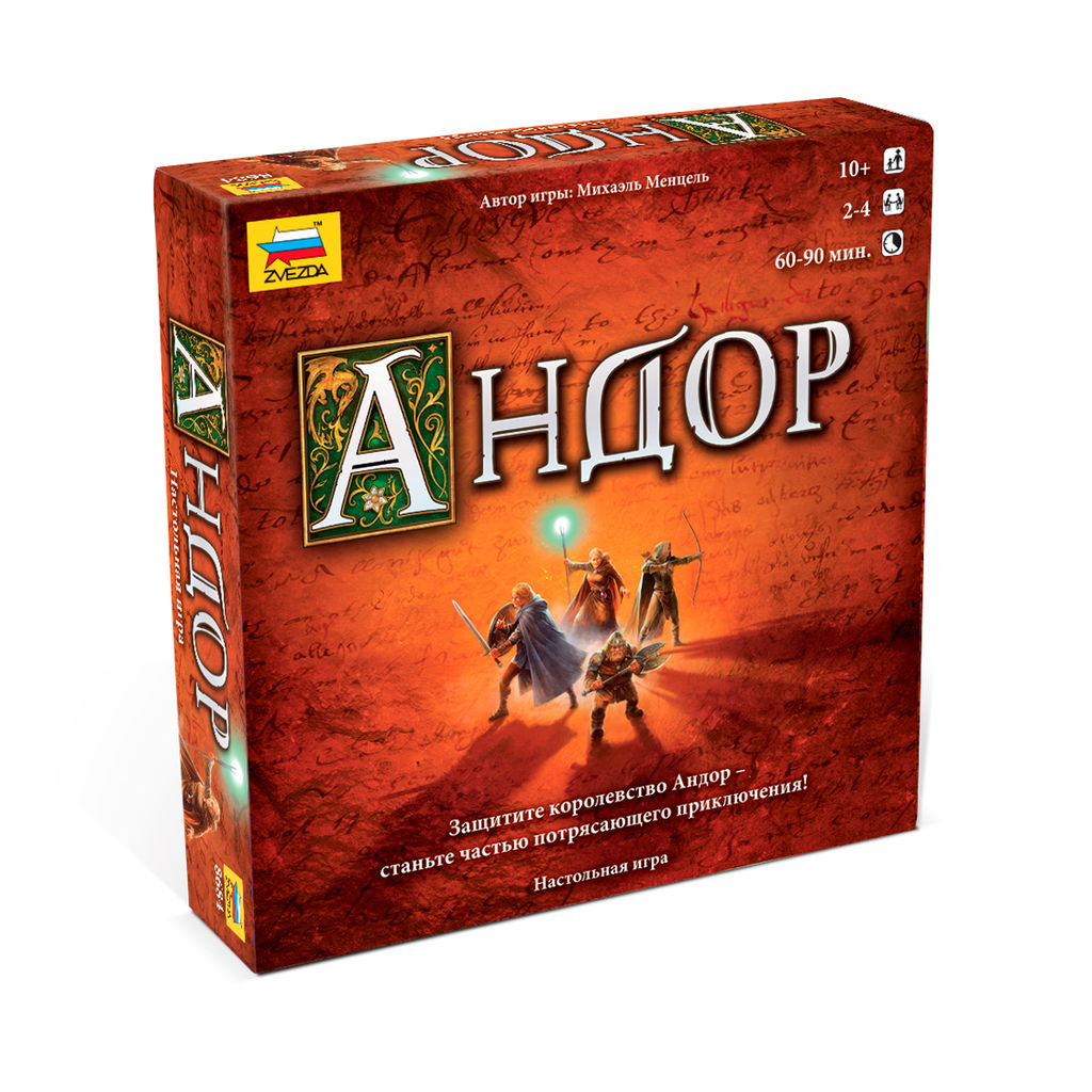 Описание Королевству Андор грозит опасность. Из диких лесов и с высоких гор враги нападают на замок старого короля Бранда. Только небольшая команда героев способна противостоять злу. Удастся ли вам защитить замок? После первого приключения последует множество других. Вам придется отыскать ведьму и лечебную траву для того, чтобы излечить больного короля. В подземных шахтах вас ждут драгоценные камни и бесчисленные опасности. Наконец, вам придется выступать против вновь пробудившегося Дракона. Сможете ли вы справиться со всеми этими нелегкими задачами? Только вместе вы по-настоящему сильны и способны стать истинными героями Андора. Состав игры: - двустороннее игровое поле - игровые фишки - 41 шт. - карточки героев - 4 шт. - игровая таблица - картонные жетоны - 142 шт. - игровые карточки - 138 шт. - кубики D6 - 20 шт. - деревянные жетоны - 14 шт. - фишка рассказчика - картонная башня - мешочки - 15 шт. - правила игры - памяткаОбязательный