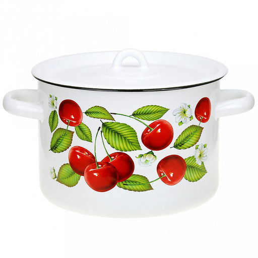 • "Вишня ягоды" Кастрюля эмалированная 4,5л, д21см, h14см, цилиндрическая форма, металлическая крышка, белый (Россия)