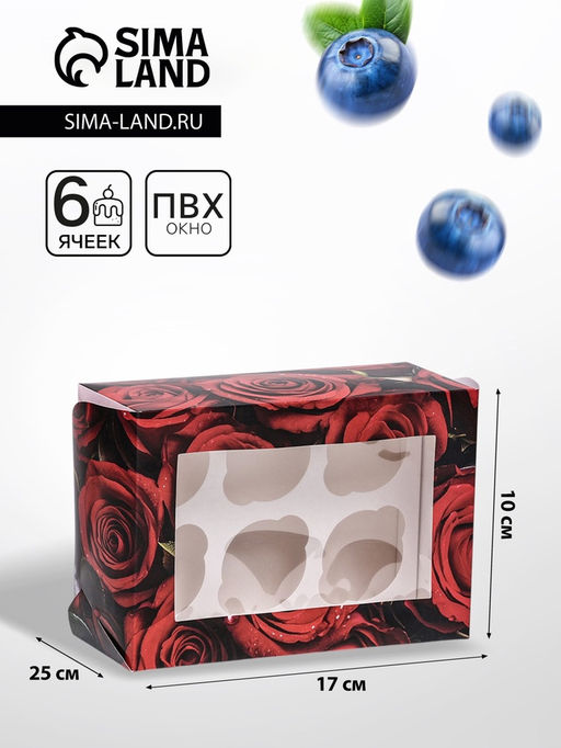 • Коробка для 6 капкейков с окном, «Розы», 25×17×10 см
