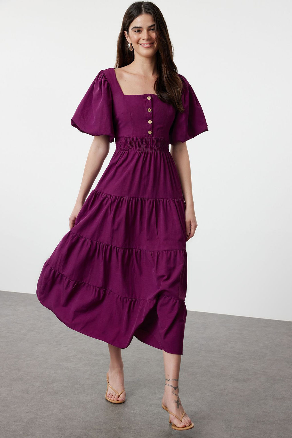 • Murdum Belden Ac?lan Gipe ve S?rt Detayl? Kare Yaka Maxi Dokuma Elbise TWOSS24EL00431