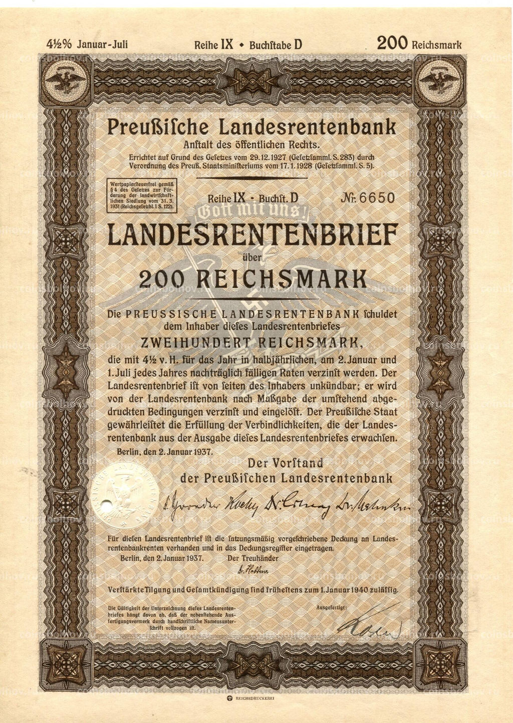 • Облигация 4,5% 200 рейхсмарок 1937 года Германия