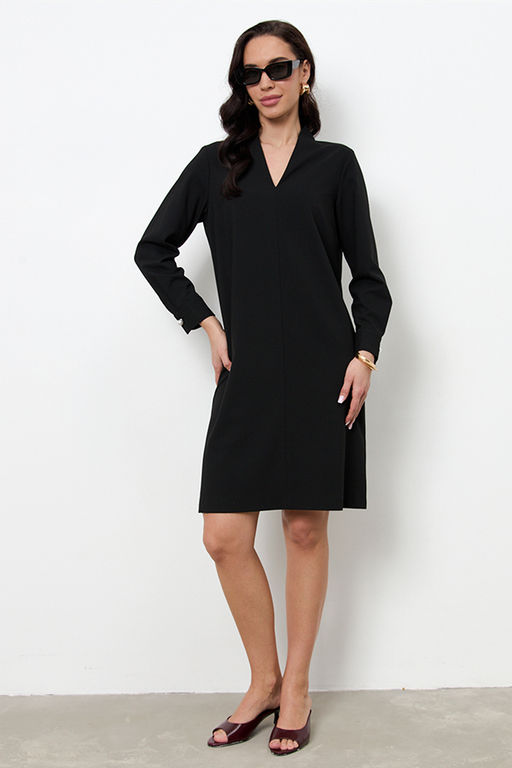 Платье свободного силуэта из плательной ткани. По центру передней части изделия выполнен шов. Цельнокроеная стойка, переходящая в V-образный вырез горловины, визуально делает фигуру стройнее. Втачной длинный рукав. Низ рукава на манжете с застёжкой на пуговицы-жемчужины.