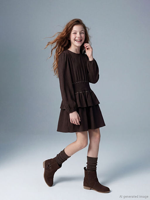 • Bisiklet Yaka F?rf?rl? Ta? Detayl? K?z ?ocuk Elbise