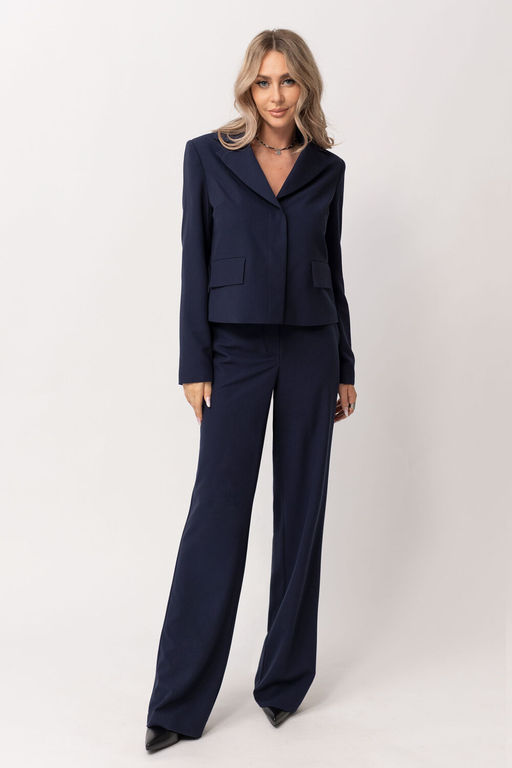 Жакет прямого силуэта с центральной застежкой на пришивные кнопки, с втачным воротником и отложными лацканами пиджачного типа. По переду с нагрудными вытачками. На уровне линии талии расположены прорезные карманы с листочками. Спинка со средним швом. Рукав втачной, длинный. Брюки прямые, с отрезным поясом, застегивающимся на одну петлю и пуговицу. По спинке пояс присборен на резинку. В боковых швах расположены карманы. Застежка гульфик.­