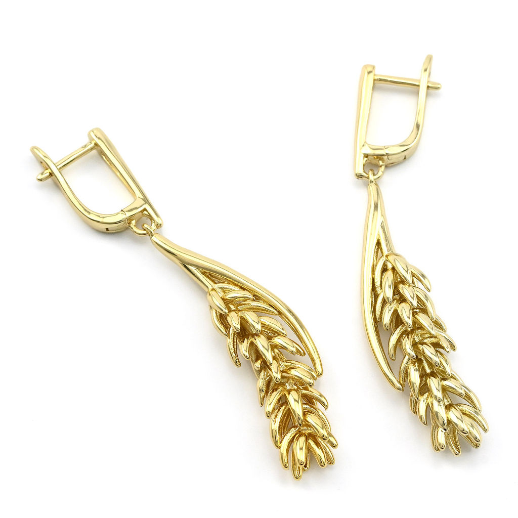 Длинные серьги в форме пшеничного колоса изготовлены из латуни с позолоченным покрытием.