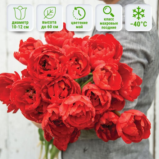 Это махровый поздний сорт тюльпана, известный своими большими и густыми цветками, диаметром до 12 см (бокал до 7 см высотой). Лепестки этого сорта имеют яркий алый цвет, который сохраняется на протяжении всего периода цветения. Высота растения достигает 40-50 см, что делает его подходящим как для садовых композиций, так и для срезки. Цветение начинается в конце апреля и продолжается до начала мая, радуя своей красотой в течение нескольких недель. Зимостойкость -40C.