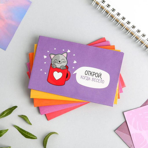 В набор конвертов Открой, когда (котик) входит 5 конвертов. Размер конвертов (ширина х высота): 11 х 7 см.