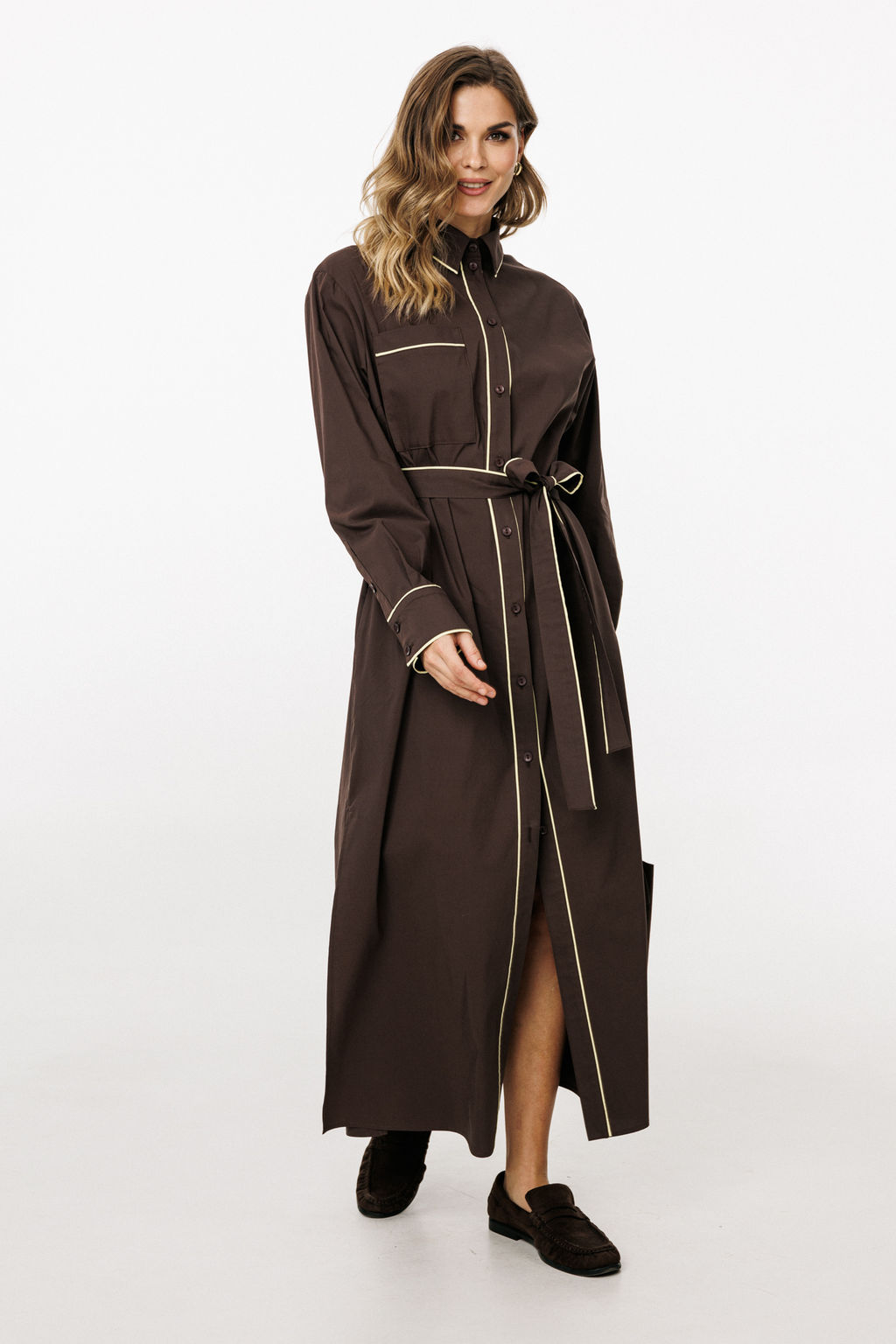 Платье выполнено из плательно-блузочной ткани. Платье прямого силуэта. По переду один накладной нагрудный карман и центральная застежка до верха с отрезной планкой с петлями и пуговицами. На спинке обработаны кокетка и складки от неё. Горловина округлой формы, обработана воротником рубашечного типа с отрезной планкой. Плечевой шов удлинен. Рукав рубашечного покроя, одношовный, со складками и обтачкой прорези по низу. Низ рукава обработан притачной манжетой, застегивающейся на петли и пуговицы. В боковых швах обработаны карманы и разрезы. В комплект входит съемный пояс из основной ткани. Платье декорировано контрастным кантом по отлету воротника, кокетки спинки, манжетам, карману, планкам и поясу.