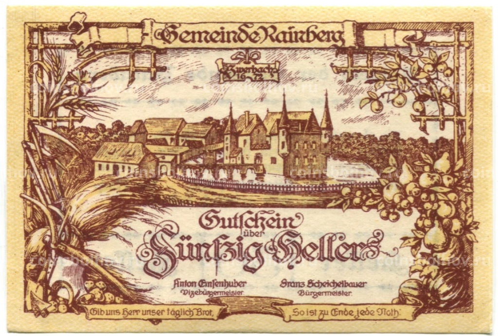 Банкнота 50 геллеров 1920 года Австрия Райнсберг (нотгельд)