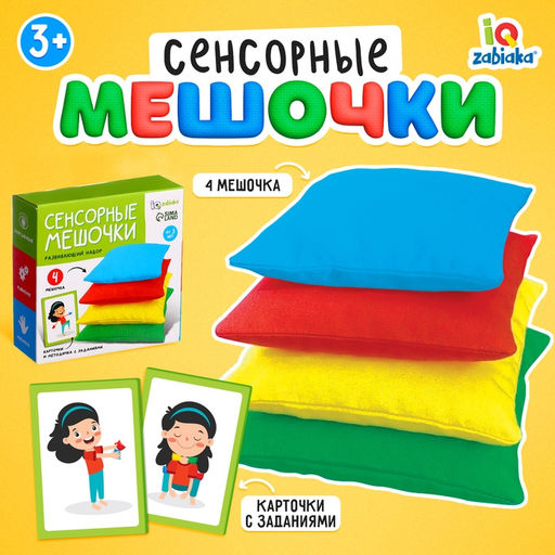 Описание товара Развивающий набор «Сенсорные мешочки» поможет малышу в лёгкой игровой форме закрепить и потренировать важные навыки: умение держать равновесие и осанку, межполушарное взаимодействие и многозадачность.Внутри вы найдёте 4 цветных мешочка, 5 двусторонних карточек и методичку с упражнениями.Полезные упражненияЦветовой рядПоложите перед ребёнком 4 мешочка. Попросите его запомнить последовательность и отвернуться.Далее поменяйте местами 2 мешочка. Пусть малыш вернёт мешочки на свои места.Усложните задание: перемешайте все мешочки и предложите ребёнку восстановить цветовой ряд.Туда-сюдаРазложите 4 мешочка в ряд. Предлагайте малышу выдвигать мешочки разного цвета на себя или от себя.Затем попросите его подвинуть мешочки красного и жёлтого цвета двумя ручками одновременно.Выложите в 2 ряда мешочки. Например, слева — 3, справа — 1. Попросите ребёнка сделать так, чтобы мешочков стало поровну. Или перенести мешочки так, чтобы справа их стало больше.РитмикаДля тренировки чувства ритма разложите 4 мешочка в ряд и попросите малыша постучать по красному мешочку 4 раза, по жёлтому — 2, по синему — 3, по зелёному — 1.Задавайте разные последовательности, чередуйте ручки: по жёлтому и синему цвету стучим левой рукой, по красному и зелёному — правой.Ищем ассоциацииПредложите малышу пофантазировать и представить, что каждый мешочек — это время года. Зелёный — весна, красный — лето, жёлтый — осень, синий — зима. Или пусть малыш сам попробует расставить мешочки по цвету сезона.Попросите ребёнка рассказать о каждом времени года: чем они примечательны?Пусть малыш назовёт цвета светофора и выложит его из мешочков подходящих цветов. Если ребёнок уже знает, как правильно переходить дорогу или другие правила дорожного движения, попросите его рассказать о них.Если нет — объясните ему, для чего нужен светофор и что означают его цвета.Предложите малышу пофантазировать. Представьте, что мешочки — это продукты, которые нужно приготовить.Жёлтый — тесто, его нужно помять: покажите малышу, как мять тесто, пусть попробует это проделать с мешочком. Зелёный — петрушка и укроп, их нужно порезать: стучим по мешочку ребром ладони. Красный — мясо, из него нужно сделать отбивную: стучим по мешочку кулаками. Синий — рыбка, её нужно посолить: покажите ребёнку, как перебирать пальчиками, чтобы посолить блюдо.Умные весыПоложите малышу в левую руку 1 мешочек, в правую — 3. Пусть ребёнок покажет, какой ручке тяжелее, изобразив весы.Переложите большинство мешочков в другую ручку — попросите снова показать, в какой руке мешочков больше.Выравнивайте «весы»: положите по 2 мешочка. Или предложите малышу догадаться, сколько мешочков нужно положить в какую руку, чтобы предметов стало поровну.Сенсорные медитацииПопросите малыша положить руки перед собой. Проведите мешочком по ручке малыша. Ведите от ладошки вверх до плеча, затем обратно.Попросите ребёнка закрыть глаза и помять мешочки руками.Проведите двумя другими мешочками по обеим рукам ребёнка. Попросите его сделать и для вас такой сеанс массажа.Польза занятий с развивающим набором «Сенсорные мешочки»С такой игрой ребёнок выучит основные цвета, потренирует мелкую моторику, логическое мышление и память.Набор рекомендован для занятий с детьми от 3 лет. Для кого: Унисекс. Возраст: От 3 лет. Развитие навык