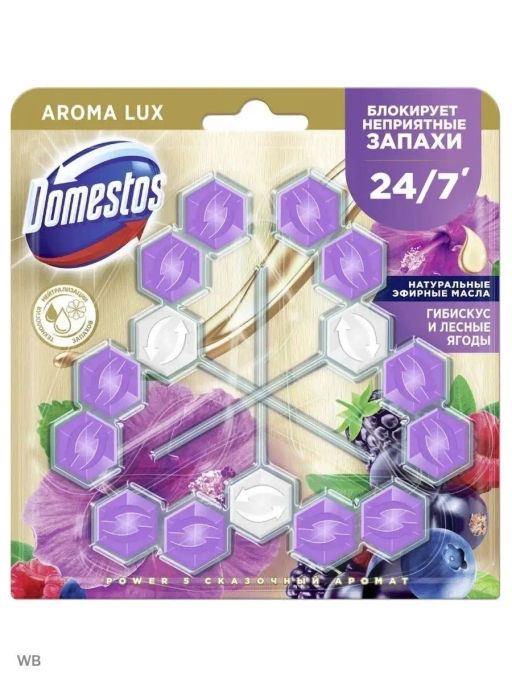 Блок для туалета Domestos Power 5 Trio Сказочный аромат против известкового налета и неприятного запаха — это пять преимуществ, помогающих обеспечить защиту от загрязнений и микробов и сохранить чистоту и блеск. При каждом смывании появляется яркий аромат гибискуса и лесных ягод на срок до 4 часов и обильная пена, которая борется с налетом, поддерживая гигиену и блеск поверхности унитаза. Туалетный блок для унитаза Доместос содержит активное вещество, которое под действием напора воды ополаскивает всю поверхность унитаза, защищая от бактерий и помогая предотвращать известковый налет. Блок для унитаза Domestos Power 5 Trio Сказочный аромат: предотвращает известковый налет
