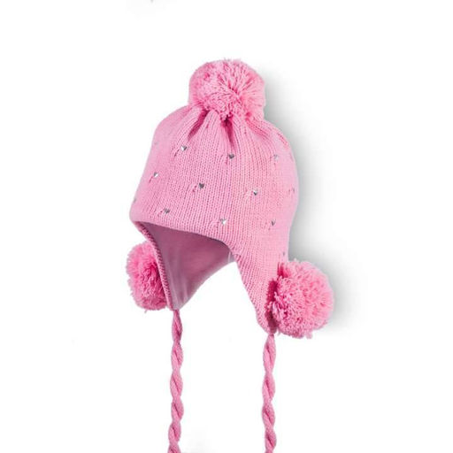 Шапка детская трикотажная на подкладке, с цельновывязанными наушниками, со стяжкой, с тремя помпонами и завязками. основное переплетение - кулирная гладь с переносом петель. в качестве отделки выполнена термоаппликация из страз.