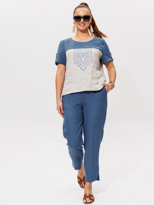 Очень стильный, удобный комплект состоящий из блузки и брюк, выполнен из 100% льна двух цветов. Блузка прямого силуэта с коротким рукавом который украшен патой, застёгивающий на петлю и пуговицу .Авторская вышивка в народном стиле, очень украшает данное изделие.