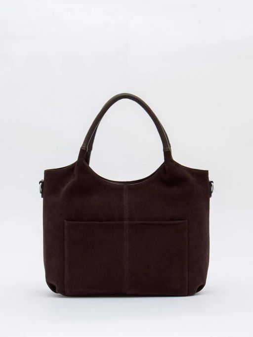 Базовая сумка, выполнена из натуральной замши и кожи. Дополнена серебристой фурнитурой. Данная модель закрывается на молнию, носится в руке за встроенные ручки. Или на плече, в комплекте имеется ремень с регулировкой длины. Каркас полужесткий.