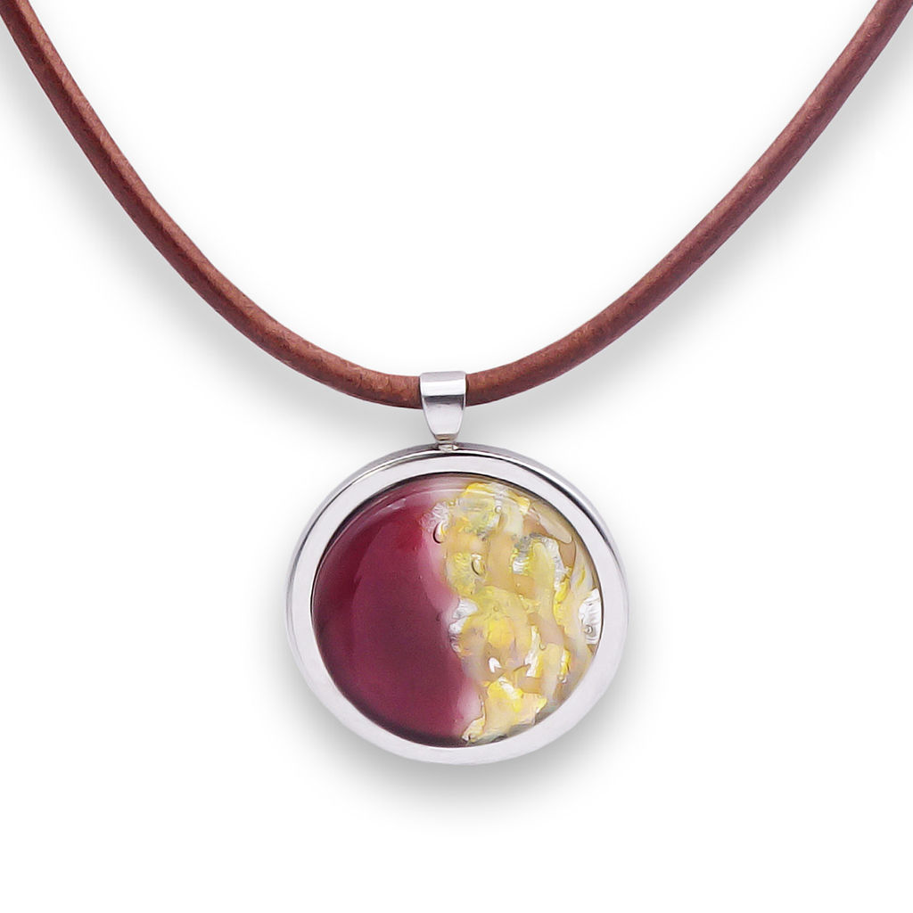 Колье изготовлено из натуральной кожи, муранского стекла и гипоаллергенной ювелирной стали, что очень важно для людей с чувствительной кожей. Металл не темнеет и не подвергается воздействиям окружающей среды, надолго обеспечивая красивый внешний вид изделия. Длина колье - 46 см + 5 см. удлиняющая цепочка. Диаметр стеклянного элемента - 2,5 см. Вес - 20 гр.­