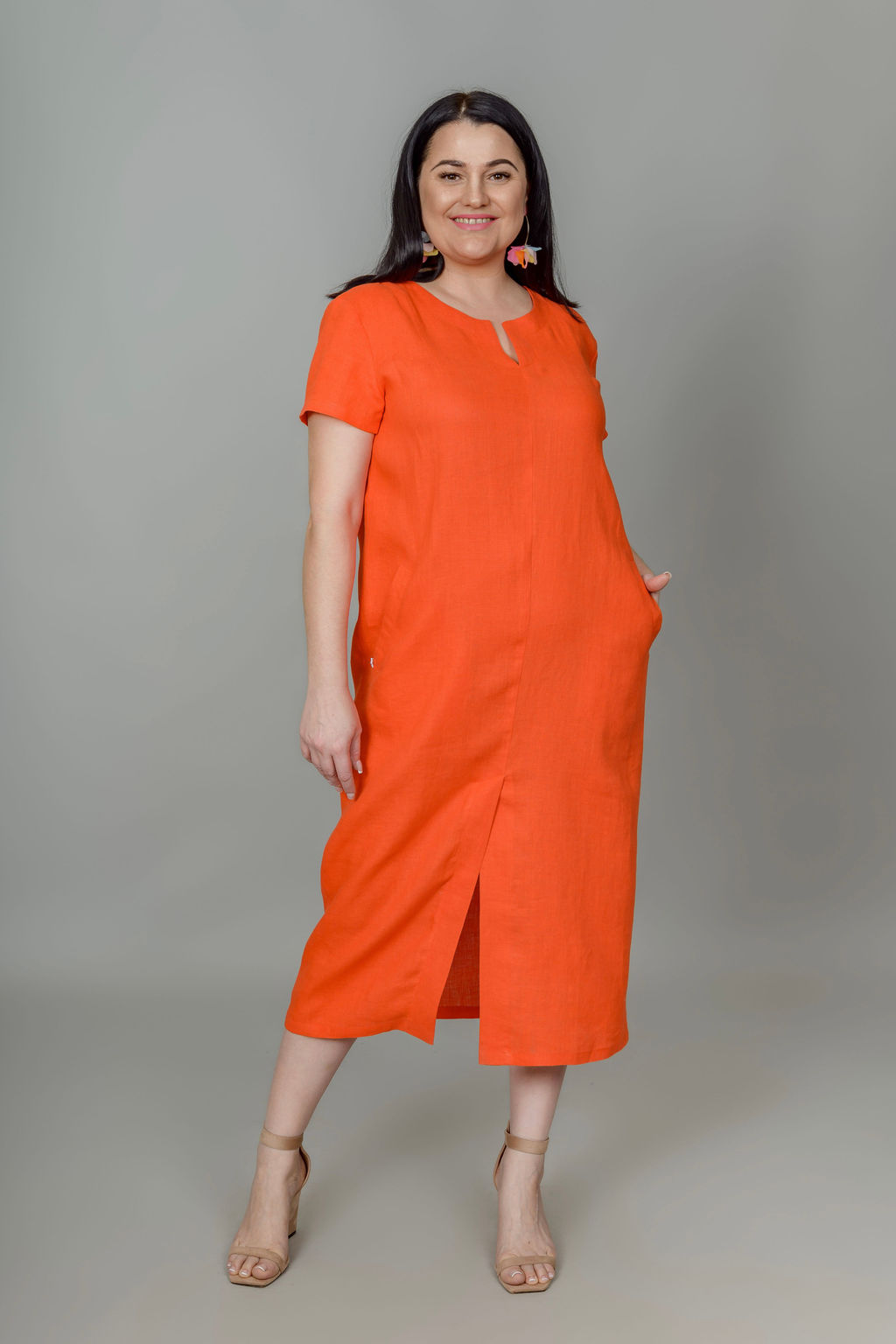 Льняное платье-футляр предлагается как базовая вещь гардероба. Рукав короткий. Имеются 2 кармана. По передней части платья внизу шлица. Благодаря крою с нагрудной вытачкой и прямому силуэту, модель подходит для фигур большой полноты.