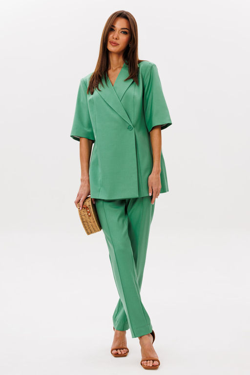 Состав: Вискоза-32%; ПЭ-65%; Спандекс-3%; Актуальный гармоничный комплект, состоящий из двубортного жакета с укороченным рукавом и прямых чуть зауженных брюк с фигурным поясом. Жакет двубортный прямого свободного силуэта в стиле оверсайз на подкладке. Изделие состоит из вертикальных рельефных деталей на полочке и спинке. Горловина оформлена английским отложным воротником с лацканами, застежка двубортная фронтальная петли/пуговицы в области незначительно чуть выше линии талии. Длина изделия по среднему шву спинки 73-75 см (в зависимости от размерного ряда). Жакет с прямым укороченным одношовным втачным рукавом длиной 32 см. Брюки полуоблегающего силуэта, слегка заужены к низу. На линии талии: талиевые вытачки. В боковых швах по низу изделия-миниатюрные разрезы 3 см. На передних полотнищах брюк проложена вертикальная декоративная строчка с защипом 0,3 мм. Линия талии в изделии завышена на 2-3 см. Пояс состоит из фигурных деталей спереди, имитирующий корсет. На спинке в деталь пояса фрагментарно вложена для свободы движения эластичная тесьма (резинка). На поясе расположены шлевочные держатели, при желании можно в них вставить ремень. Застежка на потайную молнию расположена в левом боковом шве, также в поясе на петли/пуговицы. Высота пояса на полочке 6,5 см, по спинке 4,5 см. Длина брюк по боковому шву 98-100 см (в зависимости от размерного ряда). (фурнитура может отличаться от представленной на рекламном фотоматериале) Особые рекомендации: рекомендуется холодная деликатная ручная стирка, без использования отбеливающих СМС, без интенсивного трения. Сушка в вертикальном положении. ВТО с минимальным паром. -- Характеристики -- Состав: Вискоза-32%; ПЭ-65%; Спандекс-3%; Сезон: Лето Рост: 164 Страна бренда: Беларусь