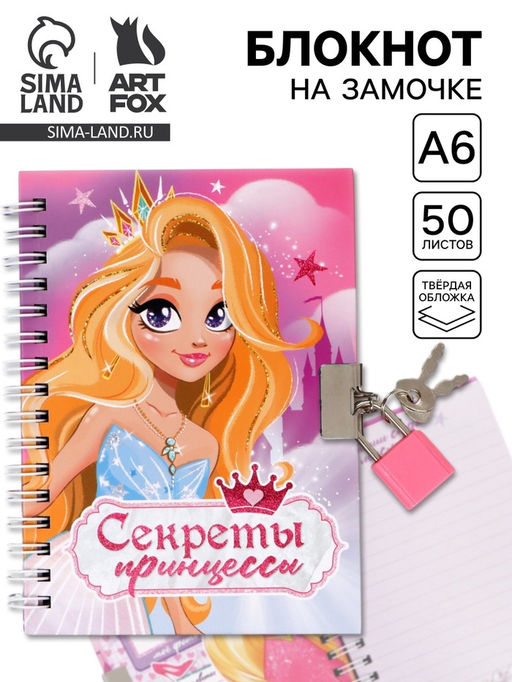 • Блокнот на замочке А6, 50 листов в твердой обложке Секреты принцессы