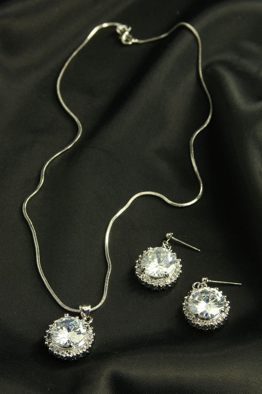 Комплект состоит из колье и серьги. Изделие выполнено из металла серебряного цвета и украшено стразами