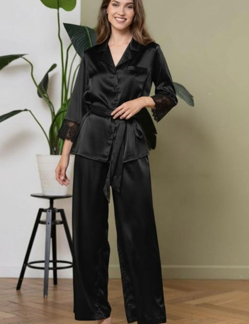 Комплект Mia-Amore состоит из жакета и широких брюк. Изделия комплекта выполнены из смесового однотонного шелка. Кружево на рукавах жакета инкрустировано кристаллами Swarovski. Линию талии можно подчеркнуть за счет пояса, который идет в комплекте. Состав:70% натуральный шелк, 25% полиэстер, 5% эластан