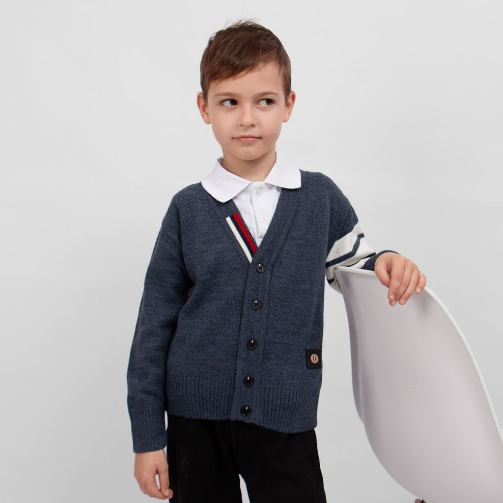 Стильный, тёплый, кардиган для мальчика. Выполнен из вязаного трикотажа и декорирован лаконичным рисунком. Модель идеально сочетается с классическими брюками и джинсами, приятная на ощупь, отлично подойдёт как для праздничного, так и для повседневного образа. На рукавах и по низу изделия манжеты, вывязанные резинкой.