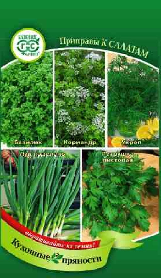 Пряные растения, вошедшие в состав смеси придают салатам неповторимый вкус, их легко и удобно выращивать на даче, они всегда под рукой, свежие летом или засушенные на зиму. Пряный базилик хорошо сочетается с помидорами, зелеными овощами, яйцами, рыбой и сыром. Чтобы сохранить его неповторимый аромат лучше измельчать его с помощью пальцев и добавлять в блюдо перед подачей. Петрушка, укроп и лук на зелень классические пряности любого сезонного салата. Чтобы подчеркнуть свежий запах петрушки и укропа, можно перетереть их с чесноком и растительным маслом, такая простая заправка, добавленная к нарезанным свежим овощам, придаст особый вкус и аромат блюду. Лук на перо ранняя культура с высоким содержанием витаминов и микроэлементов. Весной, из зелени лука, можно сделать полезный салат с яйцами, заправив его лимонный соком и подсолнечным маслом. Кориандр или кинзу в основном используют как пряность к свежим овощам, но можно зелень или семена добавить в консервированный салат получится вкусно и необычно.