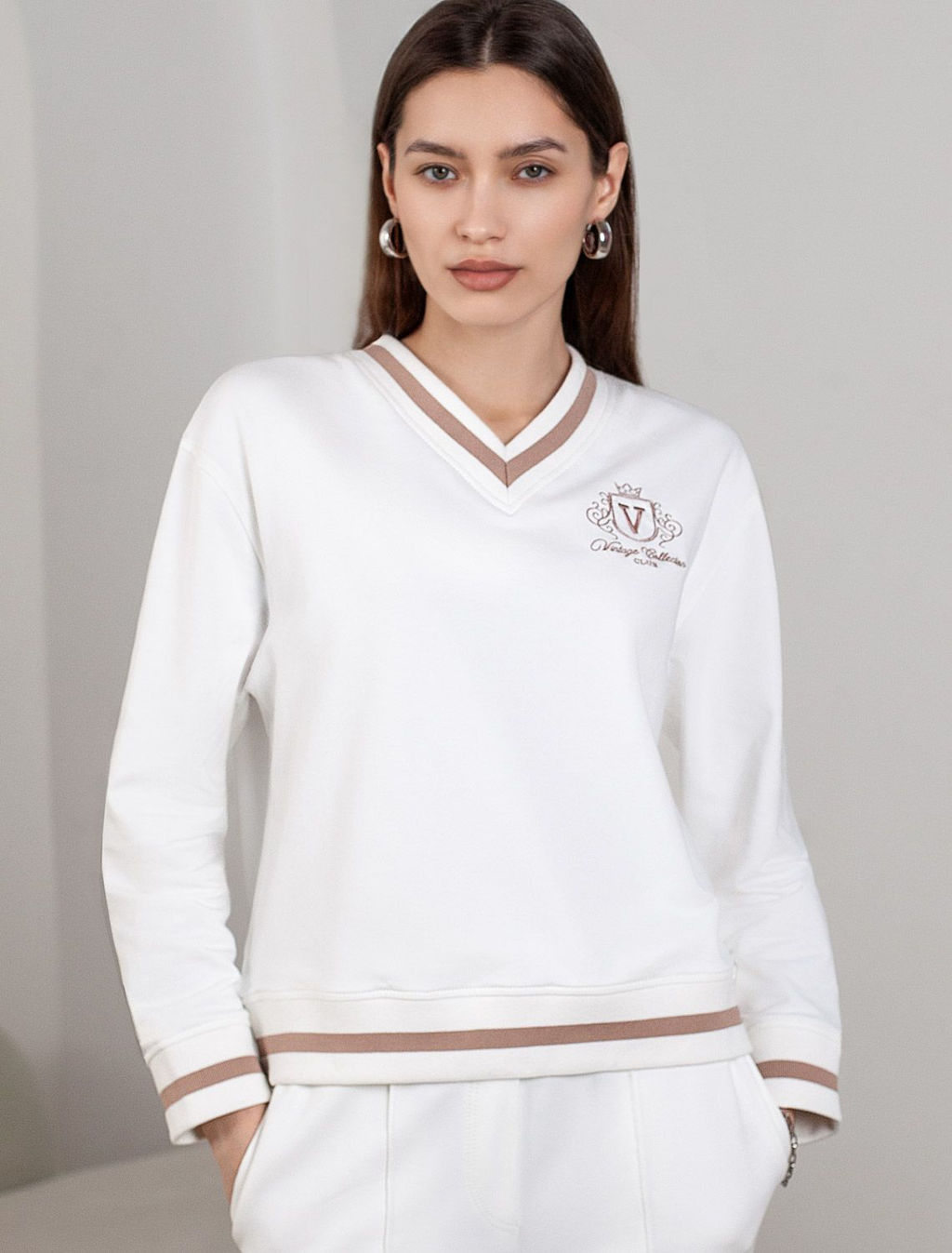Свитшот белого цвета среднего объема с V вырезом выполнен из футера двухнитки с эластаном плотностью 240 Г/м2. Натуральный хлопок обеспечивает мягкость и оптимальный теплообмен весной и летом. Нежный материал дарит ощущение уюта, а премиальное качество изготовления гарантирует долговечность и сохранение формы после множества стирок. Особенность свитшота - контрастные канты на горловине, манжетах и поясе, которые добавляют современный акцент и делают образ более выразительным. Аккуратная вышивка в виде логотипа бренда, расположенная на груди, придает свитшоту индивидуальности без лишней вычурности. Представлена широкая размерная линейка, включая маленькие и большие размеры, что позволяет подобрать идеальный вариант для разной фигуры .Этот уютный свитшот отлично подходит для повседневной носки благодаря своей комфортной посадке и нежной текстуре. Свободный джемпер из футера станет идеальным выбором для активного отдыха, обеспечивая стильный внешний вид и удобство. Рекомендуем сочетать с артикулами: D44.168, D46.059, D49.171 -- Характеристики -- Состав: 95%Хлопок 5%ПУ Плотность: 240 Г/м2 Параметры модели на первом фото: Рост 172, бюст 88, талия 64, бедра 88 Размер товара на первом фото: 42