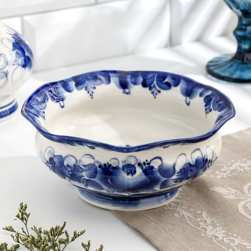 Гжель — известнейший русский народный промысел, который отличается уникальным стилем росписи посуды и предметов интерьера из керамики.Изначально гжель была цветной, а в XVIII веке мастера начали использовать кобальт. Эта тёмно-серая краска становится ярко-синей в процессе обжига изделия.Так появился узнаваемый стиль гжели — синяя пейзажная и растительная роспись, которая соединяется с геометрическим орнаментом на белоснежном фоне. Мастера расписывают каждый предмет только вручную. Набор: Нет. Форма: Круглая. Объём, л: 0.5. В наборе, шт.: 1. Объём, мл: 500. Оформление: Художественная роспись. Тематика: Цветочно-растительная. Рисунок: Да. Крышка: Нет. Тематика праздника: 8 Марта. Тематика праздника: Универсальная тематика. Покрытие: Глазурь. Тип нанесения рисунка: Ручная роспись. Ручная работа: Да. Можно мыть в посудомоечной машине: Да. Можно использовать в СВЧ-печи: Да. Текстура: Гладкая. Особенности: Без особенностей. Бесплатная доставка: Да.