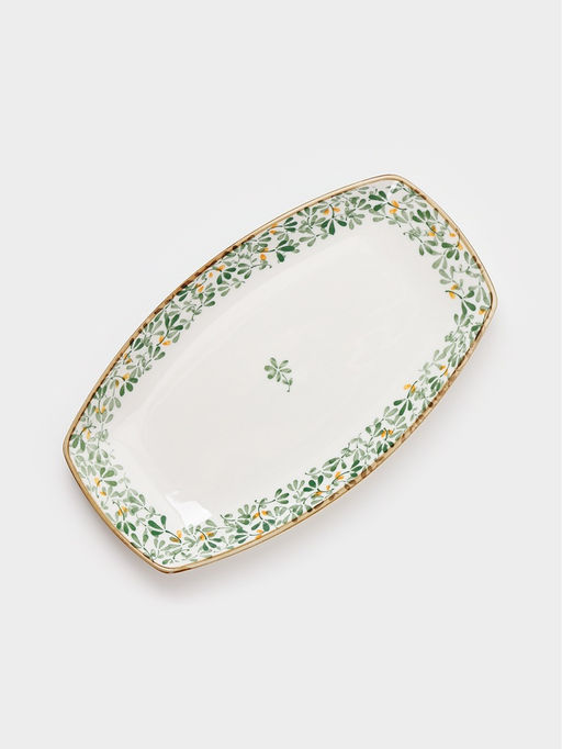 Сервировочное блюдо «Гармония лепестков» — практичное и эстетичное решение для подачи закусок, нарезок или десертов на общий стол. Его вытянутая фигурная форма (30×18 см) и небольшая глубина (3,5 см) создают удобную зону для компоновки блюд, а нежный цветочно-растительный орнамент в бело-зелёной гамме добавляет лёгкую декоративность без излишеств. Фарфор обеспечивает прочность, а глазурованная поверхность сохраняет свежесть рисунка даже при частом использовании.ОсобенностиРастительный деколь нанесён под глазурь — устойчив к посудомоечной обработке и безопасен для СВЧ.Фигурный контур блюда подчёркивает индивидуальность сервировки, не нарушая функциональности.Гладкая поверхность не впитывает запахи и легко очищается после использования.Универсальная тематика узора подходит как для повседневного стола, так и для праздничной подачи.Белый фон с акцентами зелёного создаёт ощущение чистоты и природной гармонии.Для тех, кто сервирует с вниманием к деталямЭто блюдо подойдёт тем, кто ищет баланс между формой и содержанием. Оно не перетягивает внимание на себя, но придаёт завершённость всей композиции на столе. Расположите на нём сырную нарезку, фрукты или канапе — и каждый гость почувствует, что за этим столом продумано всё, включая посуду. Набор: Нет. Тематика: Цветочно-растительная. Рисунок: Да. Крышка: Нет. Символ года: Нет. Тематика праздника: Универсальная тематика. Вид тарелки: Плоская. Можно мыть в посудомоечной машине: Да. Можно использовать в СВЧ-печи: Да. Текстура: Гладкая. Особенности: Деколь. Бесплатная доставка: Да. Размеры товара: 1/1/1. Примечание: Оттенок данного товара может незначительно отличаться от фото/видеоизображения (в зависимости от настроек яркости вашего экрана)..