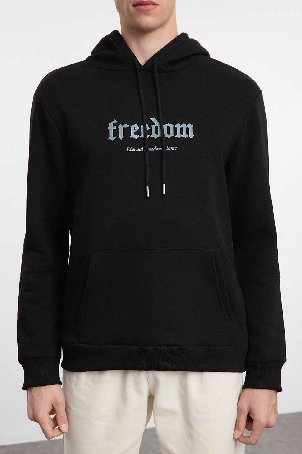 Siyah Regular/Normal Kesim Kabar?k Yaz? Bask?l? Kapusonlu Sweatshirt TMNAW25SW00105