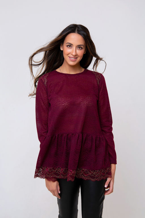 Трикотажная туника-блуза глубокого оттенка, выполнена из полупрозрачного материала. Модель однотонная, оформлена резинкой на талии, а также вставкой из гипюра по краю изделия. Рукав длинный. Горловина округлая. Состав: 75% полиэстер, 20% вискоза 5% эластан. Длина изделия 65 см. Рост модели на фото 173 см (+ каблук).