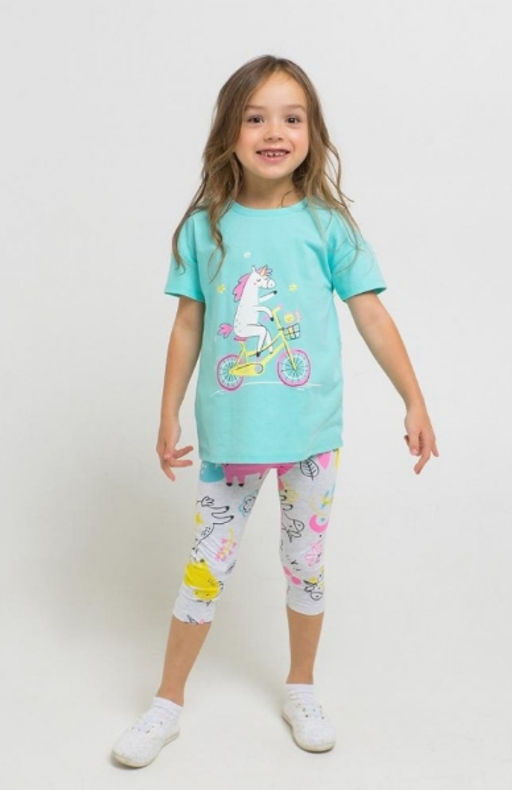 Комплект из туники и укороченных лосин. Мятная туника с короткими рукавами украшена крупным принтом на полочке. Спинка скруглена и удлинена. Короткие лосины выполнены из трикотажа супрем с эластаном. Эластан в составе позволит им дольше сохранять опрятный внешний вид.­