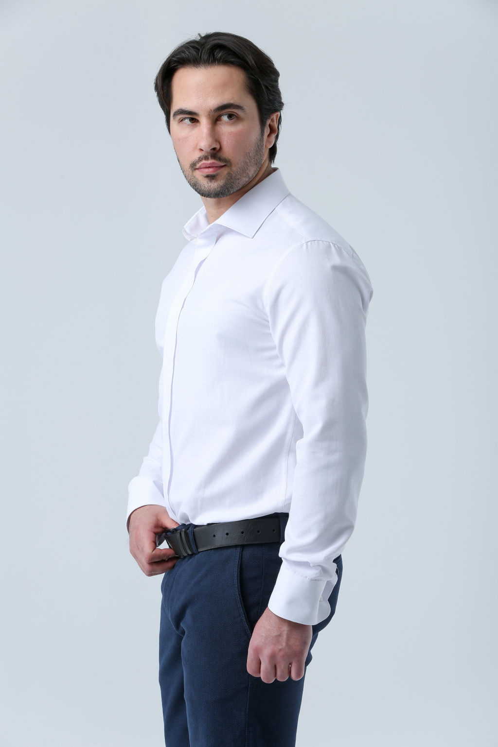 Классическая сорочка, заутюженные борта, без отделки, воротник классический с широким углом.Универсальный мажет на пуговицу или под запонку.Супатная застежка.Ткань с выработкой, рельефная. Подходит для деловых встреч и торжественных мероприятий.