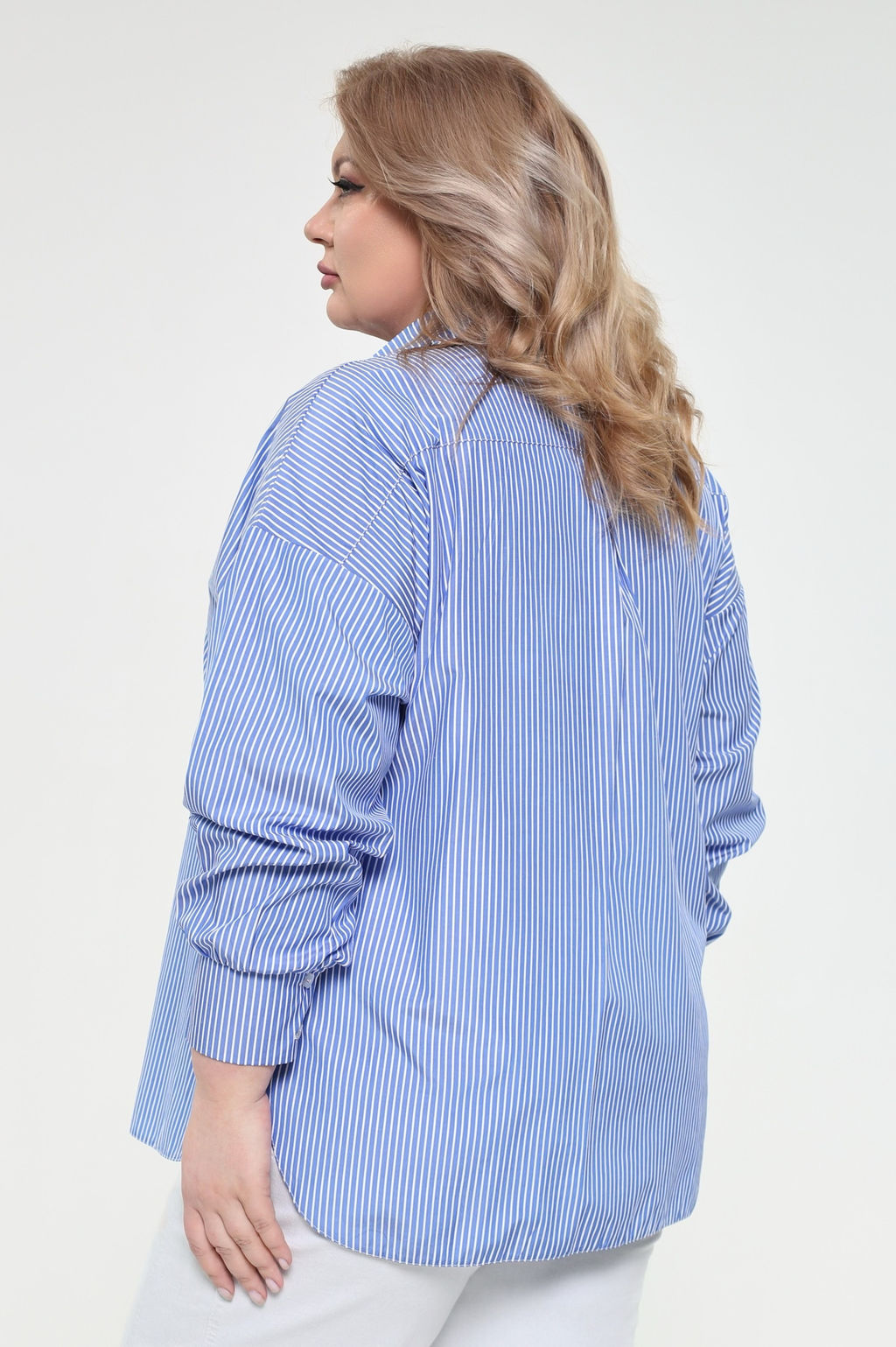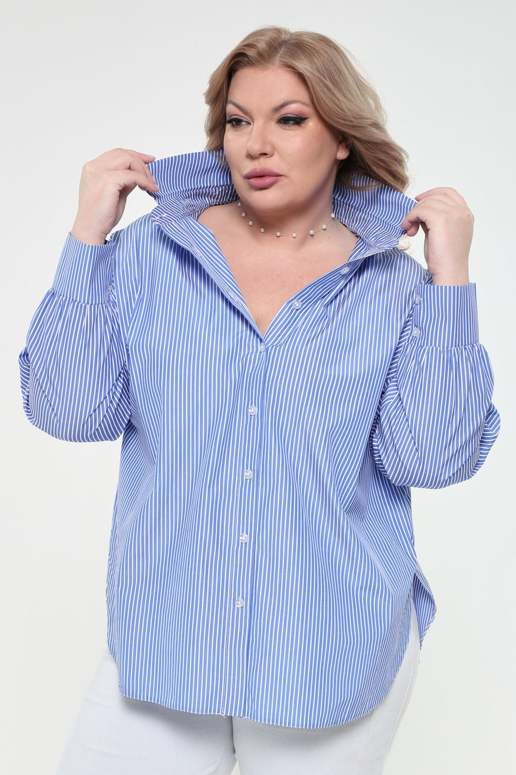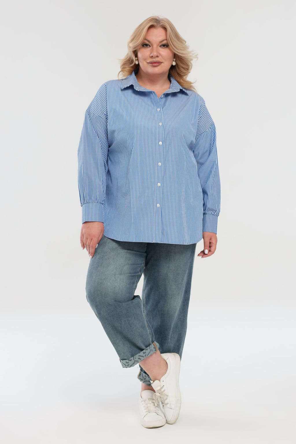 Оригинальная рубашка прямого кроя из мягкого материала. Круглый вырез дополнен классическим отложным воротником. Рукава полной длины с приспущенной проймой по низу оформлены манжетами с пуговками. Модель застёгивается на оригинальные пуговки под планку. Актуальный полосатый принт добавляет динамичности. Закругленный нижний край по бокам не сковывает движений и искусно обыгрывает фигуру, маскируя мелкие недостатки. Рубашка отлично сочетается как с брюками, так и с легинсами.