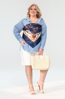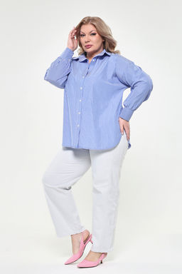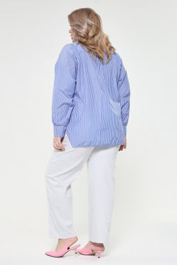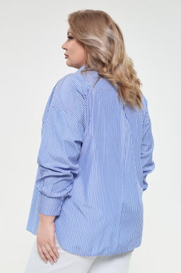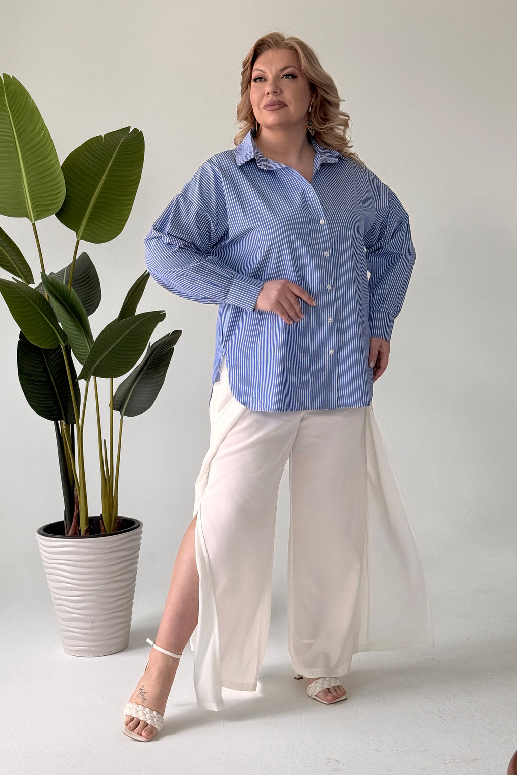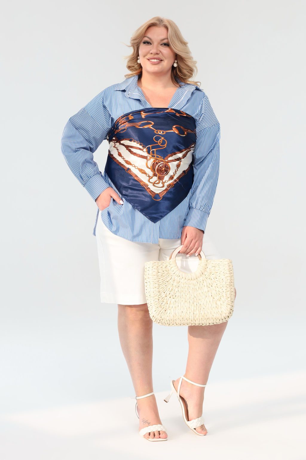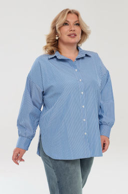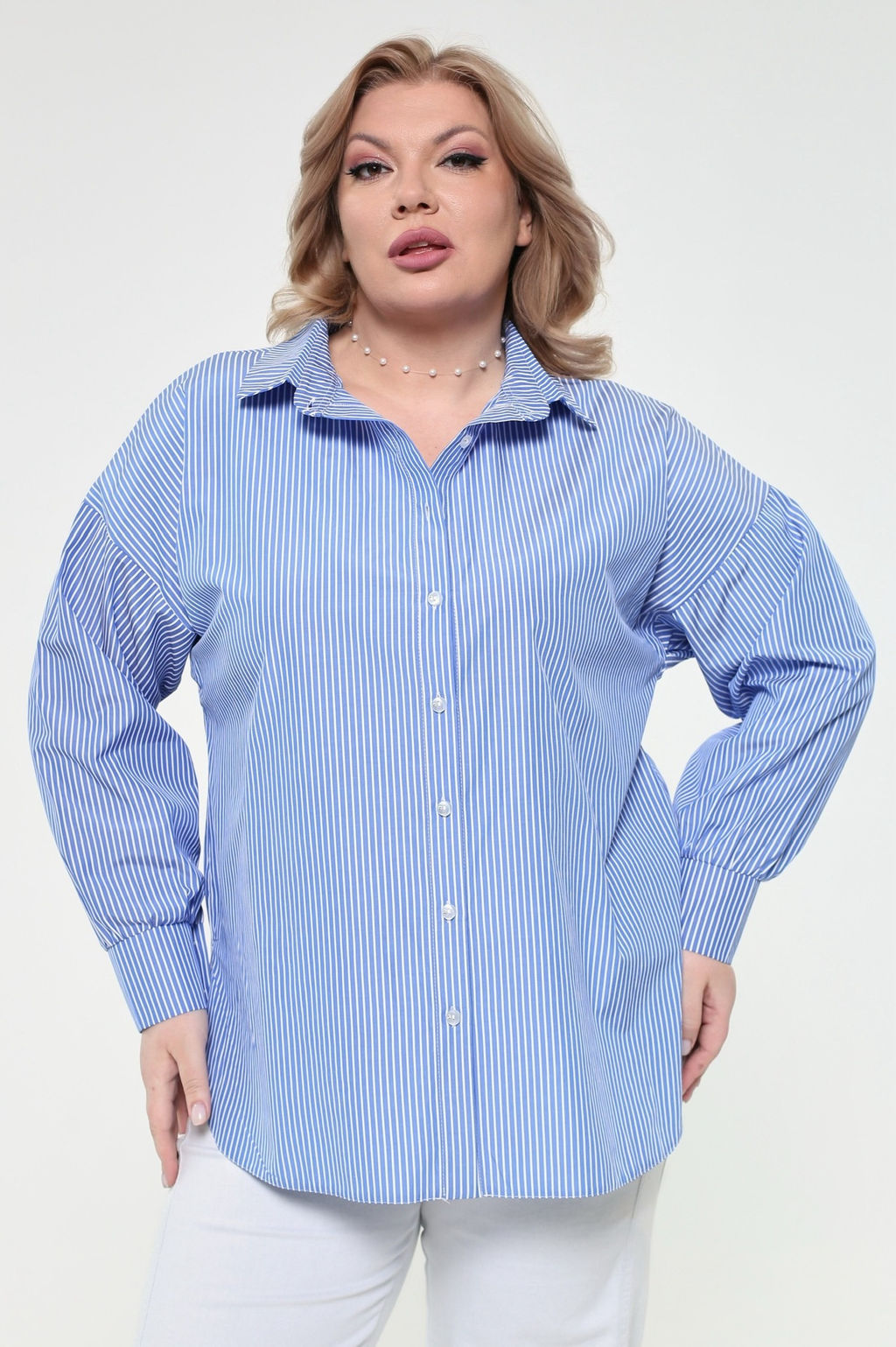 Оригинальная рубашка прямого кроя из мягкого материала. Круглый вырез дополнен классическим отложным воротником. Рукава полной длины с приспущенной проймой по низу оформлены манжетами с пуговками. Модель застёгивается на оригинальные пуговки под планку. Актуальный полосатый принт добавляет динамичности. Закругленный нижний край по бокам не сковывает движений и искусно обыгрывает фигуру, маскируя мелкие недостатки. Рубашка отлично сочетается как с брюками, так и с легинсами.