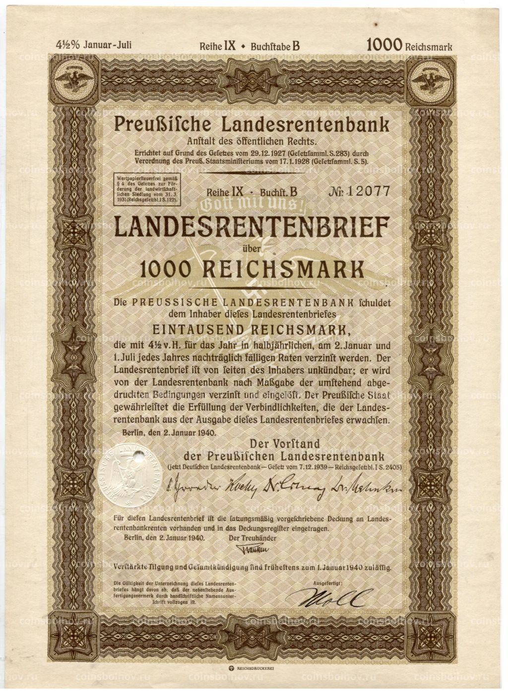 • Облигация 4,5% 1000 рейхсмарок 1940 года Германия