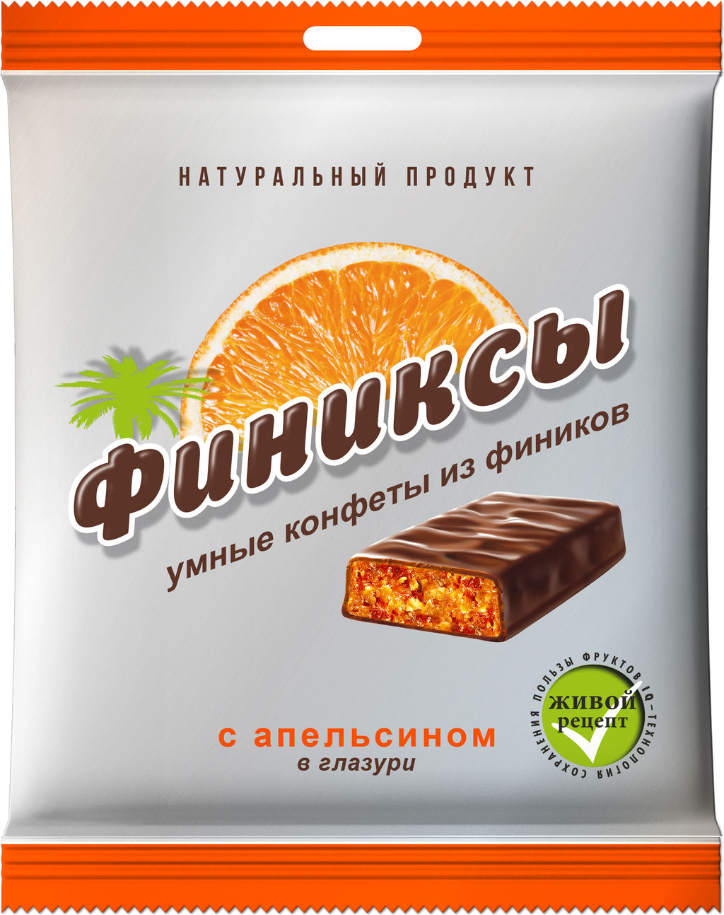 Конфеты на основе сухофруктов в глазури.ФИНИКСЫ умный подход к выбору сладостей. Конфеты из натуральных сухофруктов, покрытые глазурью это идеальная замена калорийным кондитерским изделиям, а также источник здоровья, чувства легкости и отличного настроения. Начинка из мякоти натуральных вяленых фиников и апельсинов источник витаминов и микроэлементов, прекрасно тонизирующих организм.