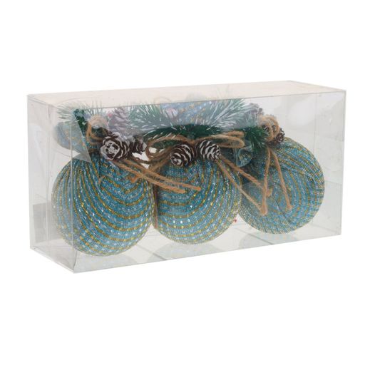 Набор из 3-х елочных игрушек в прозрачной пластиковой упаковке. Оригинальный шар обтянут тканью и декорирован искусственной хвойной веточкой с шишками. Внутри пенопластовая основа, что делает шар легким и небьющимся. Служит для украшения ёлочки и оформления праздничного интерьера.