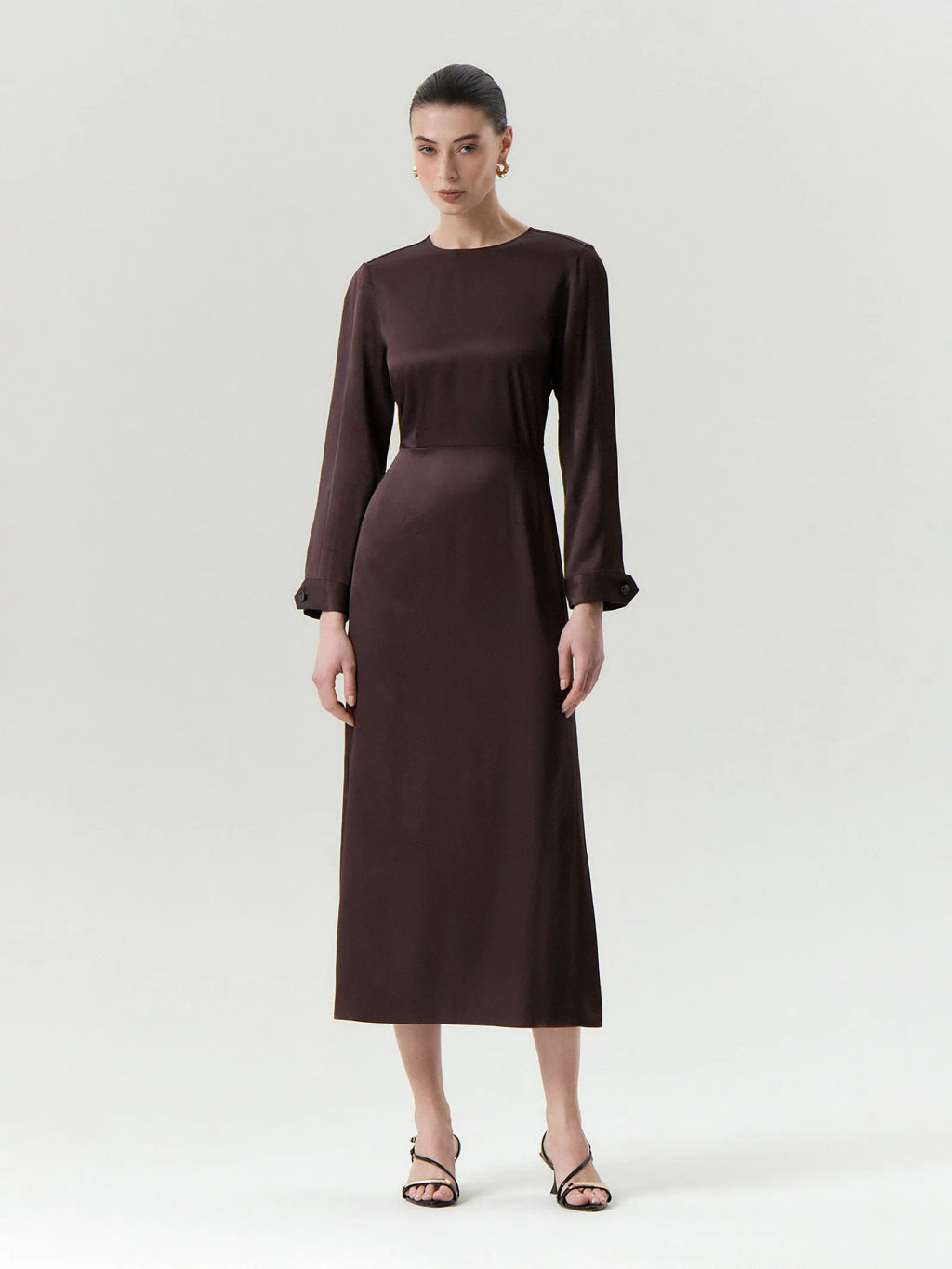 Платье в шоколадном цвете выполнено из струящегося материала с высоким содержанием вискозы. Это элегантный вариант на каждый день, который также будет достойно смотреться на деловых встречах, корпоративах, торжественных мероприятиях и праздниках. Модель миди с отрезной талией, длинным рукавом и круглым вырезом красиво садится по фигуре. Изделие выполнено без подкладки.