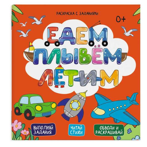 • Раскраска с заданиями арт. 49110 /10 ЕДЕМ, ПЛЫВЕМ, ЛЕТИМ /225х225 мм, 6 л., блок - офсет 120 г/м2, п