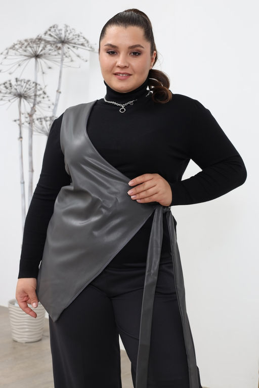 Стильный жилет на одно плечо из мягкой экокожи на вискозной подкладке, хорошо держит форму. Вытачка на груди обеспечивает оптимальную посадку по фигуре. Асимметричный низ визуально стройнит и зрительно вытягивает силуэт. Жилет завязывается сбоку на завязки.   Отлично сочетается с легкими брюками и рубашками в качестве элегантного офисного костюма. Прием многослойности помогает интересно и стильно обыграть базовые вещи.