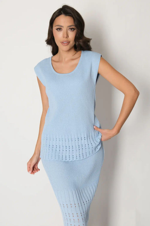Женский вязаный джемпер полуприлегающего силуэта со спущенным плечом. Джемпер выполнен кулирной гладью, нижняя треть изделия переплетением-лапша с эффектом перфорации. Джемпер можно носить в комплекте с юбкой, вывязанной аналогичным переплетением и узором. Артикул юбок И 014, И 014дл, И 017.­