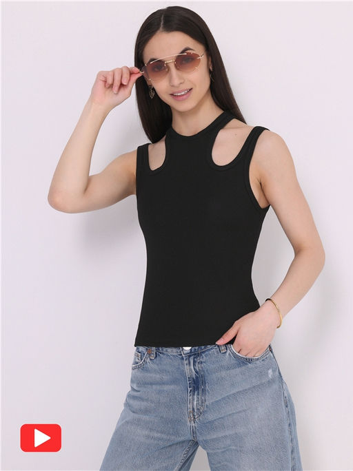 топ,ПЭ 50% + вискоза 45% + лайкра 5%,ластик / ПЭ 50% + вискоза 45% + лайкра 5%,черный / - / - / - / - / -,Женский топ выполнен из ластика - эластичного вискозного полотна в рубчик. Изделие прилегающего покроя, с округлым вырезом горловины и фигурными вырезами по плечам. Отлично сочетается с жакетами, рубашками, кардиганами. Уход: только машинная стирка (руками не стирать!) при температуре 40 градусов, без предварительного замачивания.