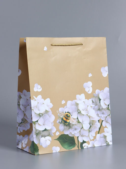 • Пакет подарочный ламинированный «Пчёлка на гортензии», бежевый, 26×12×32 см