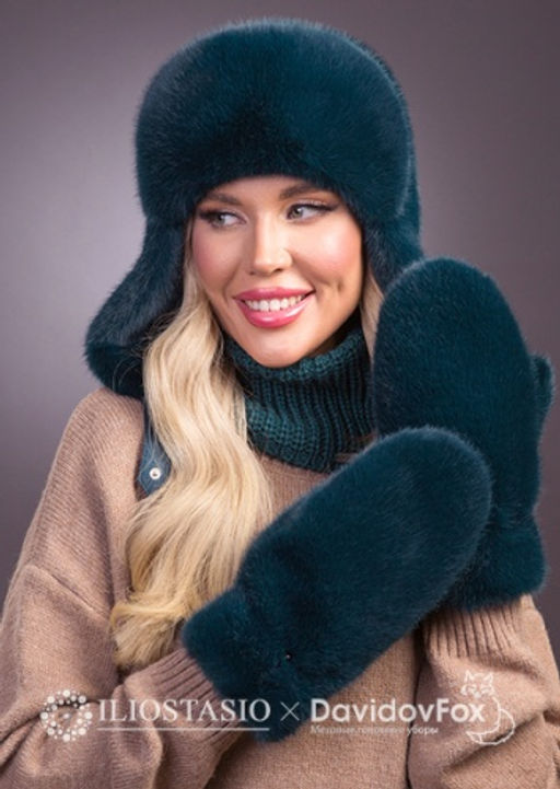 Артикул: Комплект экомех ушанка цельная изумруд, манишка, варежки