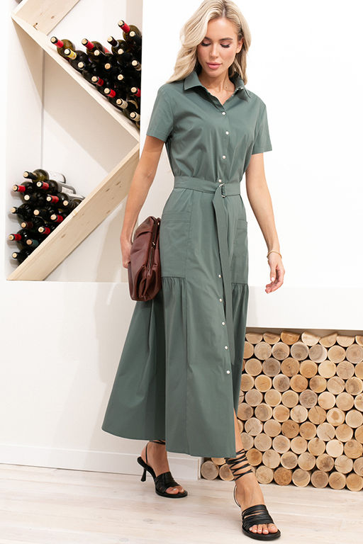 Платье полуприлегающее в области груди и свободное в области бедер, из плательной ткани. Изделие отрезное по линии талии с ярусом на юбке. На передней части юбки выполнены вертикальные рельефы с карманами. По центру передней части застёжка на кнопки. Вырез горловины обработан отложным воротником на стойке. Втачной короткий рукав. В комплекте пояс из основной ткани.