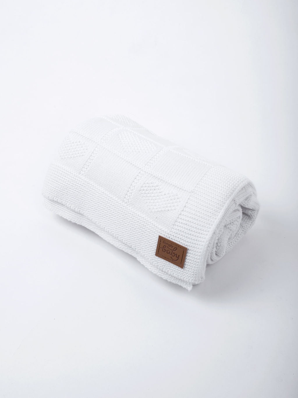 Вязаный плед из мягкого хлопка и акрила с ажурным узором в виде сердечек.