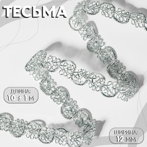 • Тесьма декоративная, 12 мм, 10±1 м, цвет серебряный
