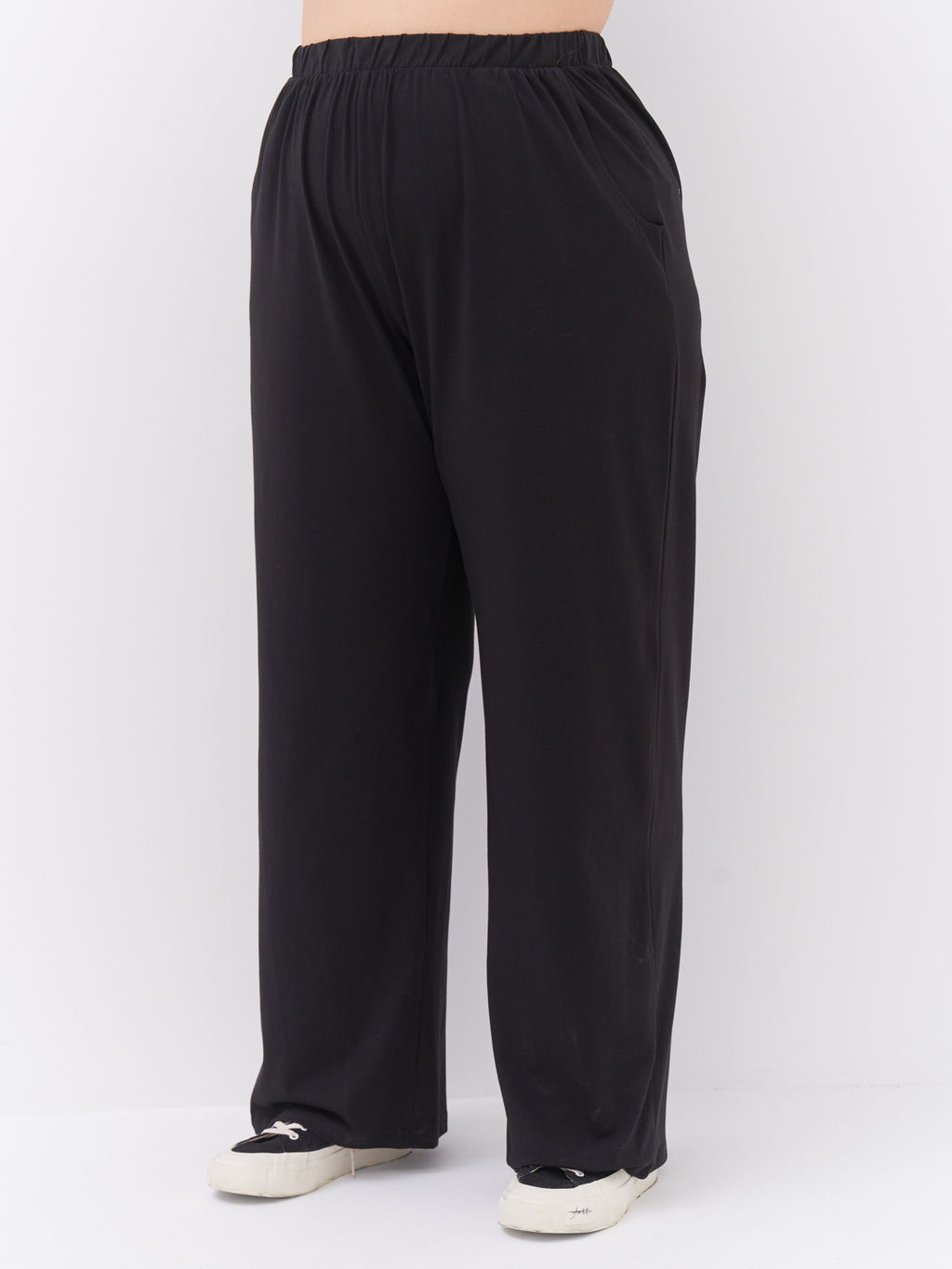 Женские брюки большого размера плюс сайз. Брюки свободного кроя в спортивном стиле из хлопкового трикотажа классического черного цвета. Высокая линия талии и мягкий пояс с эластичной лентой внутри подарят ощущение комфорта и удобство во время носки. Брюки палаццо отличаются прекрасной посадкой на полную фигуру с любым типом. В боковых швах расположены удобные карманы, в которые вы можете разместить необходимые мелочи или удобно расположить руки. Женские брюки черного цвета прекрасно сочетаются с футболками любого оттенка из нашей базовой коллекции. Эти замечательные штаны подойдут как для повседневных образов для дома или отдыха, а также для занятий спортом. Купить женские брюки можно оптом или в розницу в интернет-магазине женской одежды больших размеров Артесса Plus size. Устройте себе шопинг, не выходя из дома. Параметры модели: Размер на модели: 56-58 Рост: 175см Объем груди: 110 см Объем талии: 90 см Объем бедер: 124 см -- Характеристики -- Сезон: Лето Материал: Трикотаж Состав: 95% хлопок, 5% эластан Цвет: черный Принт: однотонный Стиль: Для полных, Повседневный, Спортивный Особенности: большие размеры Карманы: В шве Застежка: Резинка Стирка: Деликатный режим, не более 40 градусов Страна производства: Россия